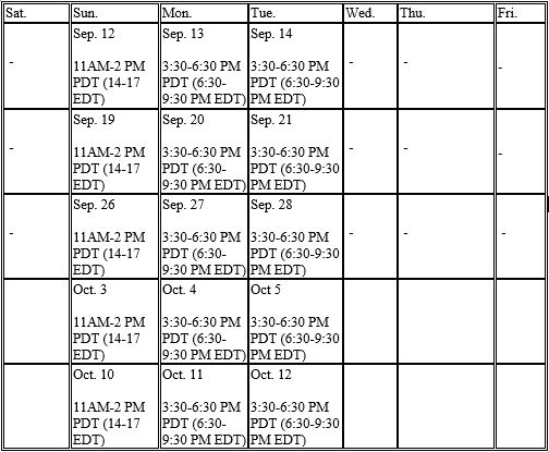 Here is the schedule of our online mock exam. Only one spot is available for each time slot to provide you with special attention and assessment by our instructor. Please pay attention to the time zones indicated in the schedule (PDT for those in BC and EDT for those in Ontario).