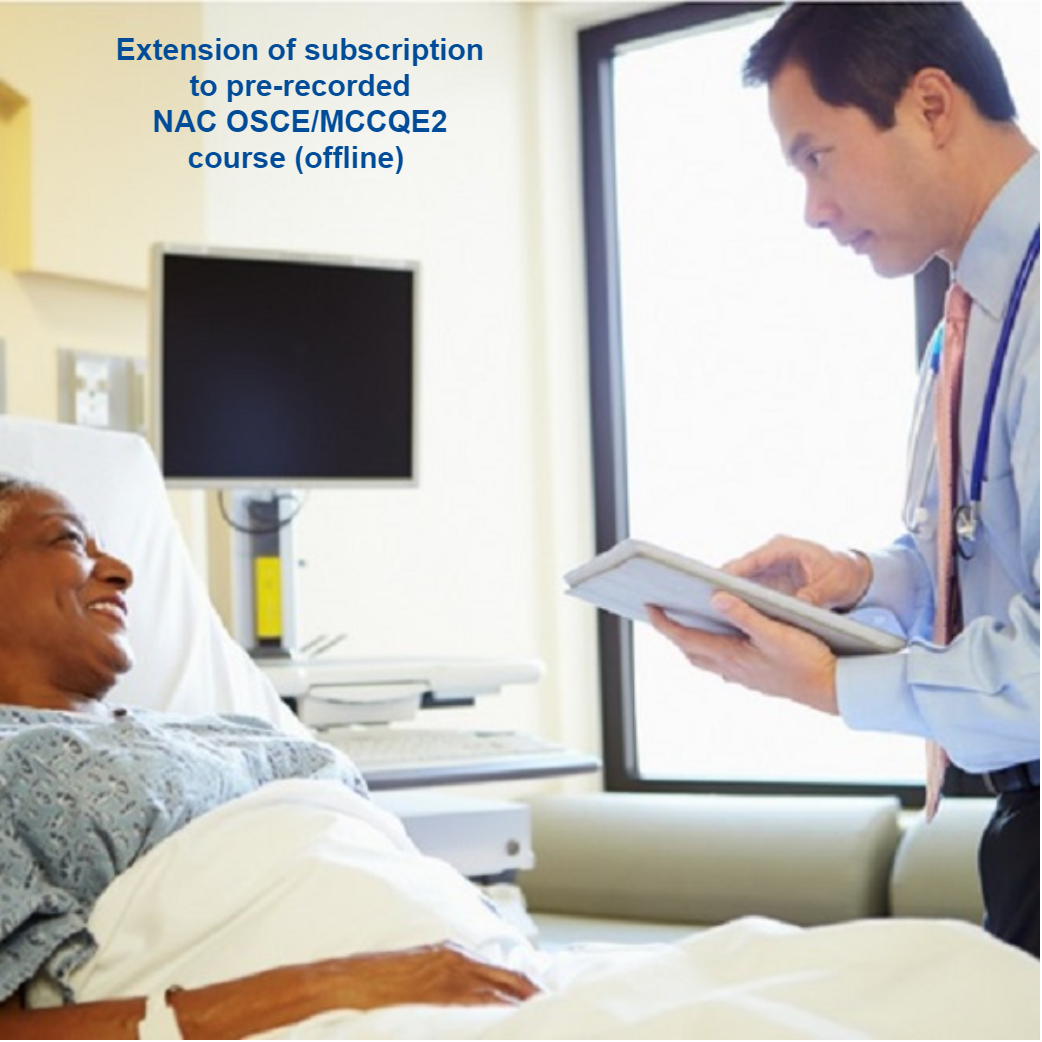 This option is only available to those who want to EXTEND their current or previous subscriptions to our pre-recorded NAC OSCE/MCCQE2 course (the offline or online version). Your subscription will be reactivated within a few hours (usually within one hour) after making the payment if you subscribed to the offline version of the course. If there is an “out of stock” badge on the website, please contact us for extending your subscription.